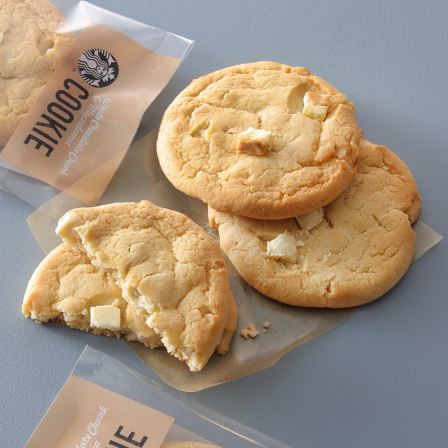 ホワイトチョコレートチャンク&マカダミアクッキーは、ホワイトチョコレートチャンクが入ったソフトな食感のクッキーです。マカダミアナッツの味わいと食感も楽しめます。 小麦の香ばしさが感じられるよう、生地には全粒粉が入っていて、さらに、マカダミアナッツの味わいやホワイトチョコレートのミルキーな味わいが引き立つよう、生地の甘さを控えめにしてあります。
