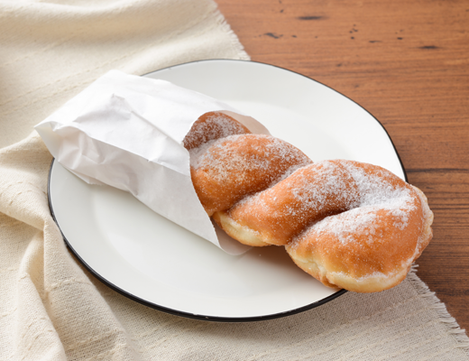 米粉でもっちりとしたドーナツに砂糖をまぶした素朴な味わいです。